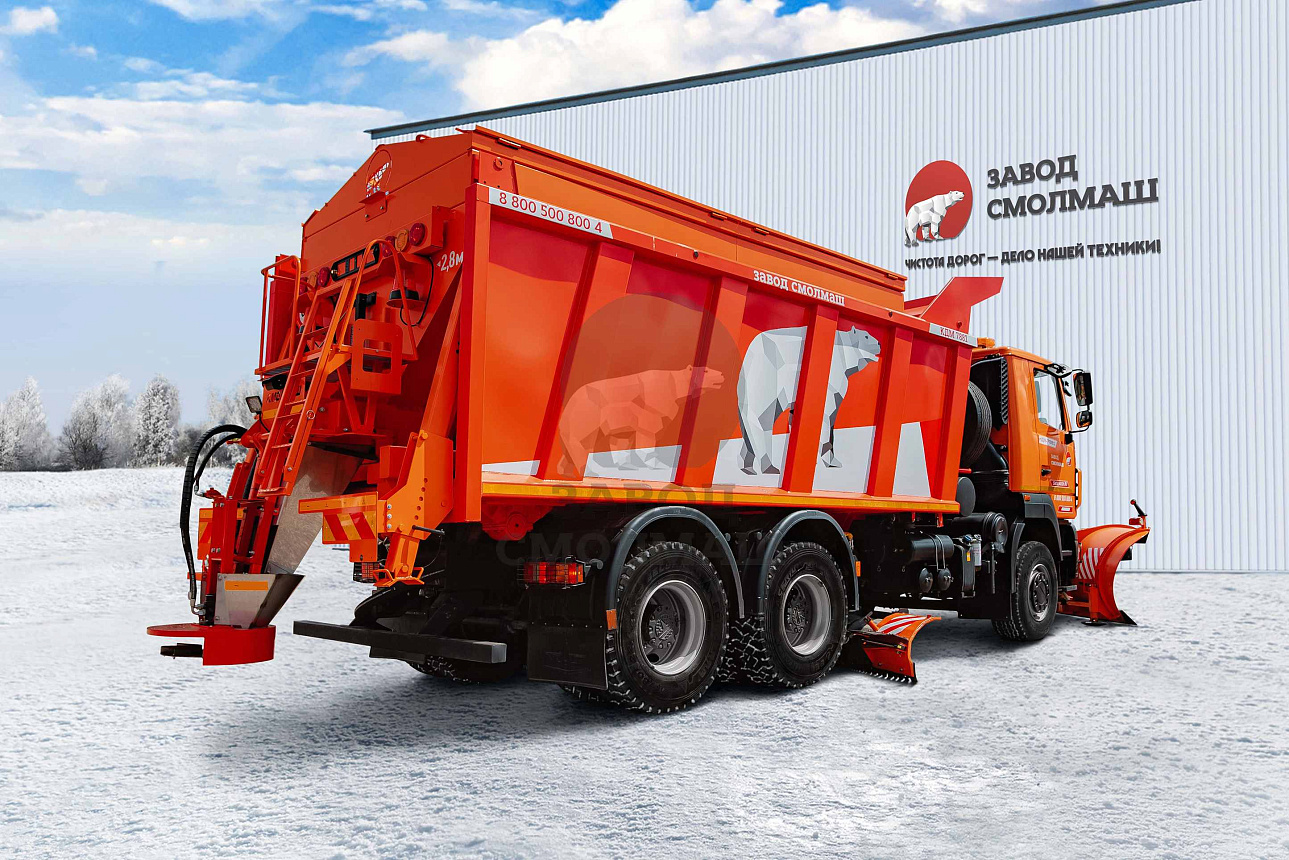 Дилерская сеть МАЗКомбинированная дорожная машина КДМ 7881220 на базе самосвала МАЗ-650128-8520-000 в комплектации. Быстросъемное пескосолеразбрасывающее оборудование. Скоростной отвал - 2,6 м.